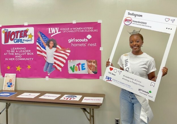 Elected officials District Judge Alyssa Levine, School Board members Liz Monterrey Duvall and Shamaiye Haynes join LWV volunteers to share their experience as women in government positions. Charlotte’s nonprofit Generation Nation students model leadership behavior by example, and Kristin Mavromatis, Program Information Manager for Mecklenburg County Board of Elections, gives scouts an authentic voting experience with mobile voting machines. Miss Queen City 2025 Maayan Eaves, returns